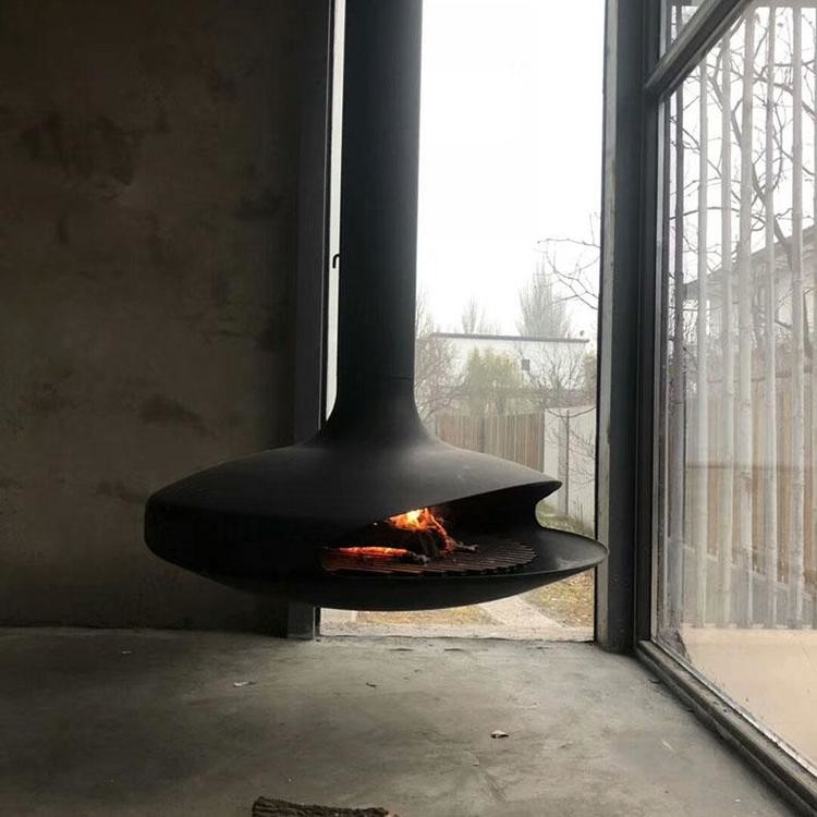 Piece stalowe do palenia drewna, podwieszone pod sufitem, kominek zawieszony